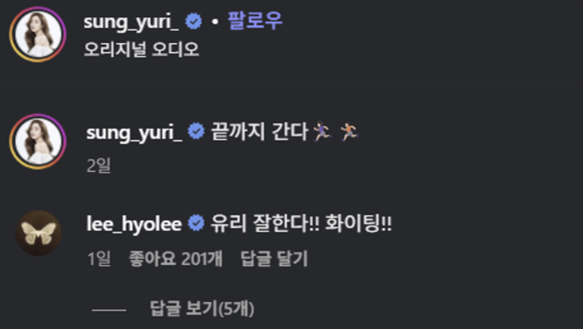 하지만 최근 tvN 예능 ‘끝까지 간다’ 티저 영상을 통해 복귀를 예고하며 팬들의 응원을 받고 있다. 이에 절친 이효리는 성유리의 SNS 게시물에 “유리 잘한다!! 화이팅!!”이라며 따뜻한 댓글을 남기기도 했다.