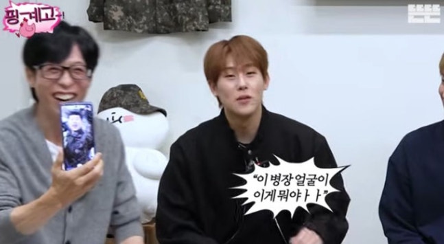 이에 주헌은 “저 제대할 때 이 사진 보내시면서 ‘이병장 이게 뭐야?’라고 했다. ‘런닝맨’에서도 형이 이 사진을 보여주셨다”라고 하소연했다. 유재석은 “이거 보고 너무 웃었다. 선임하사 님인 줄 알았다”라고 말했고 주헌은 “지금 봐도 적응이 안 된다”라고 인정했다. 이에 유재석은 “지금은 돌아왔다”라며 연예인 비주얼로 다시돌아온 주헌을 언급했다.