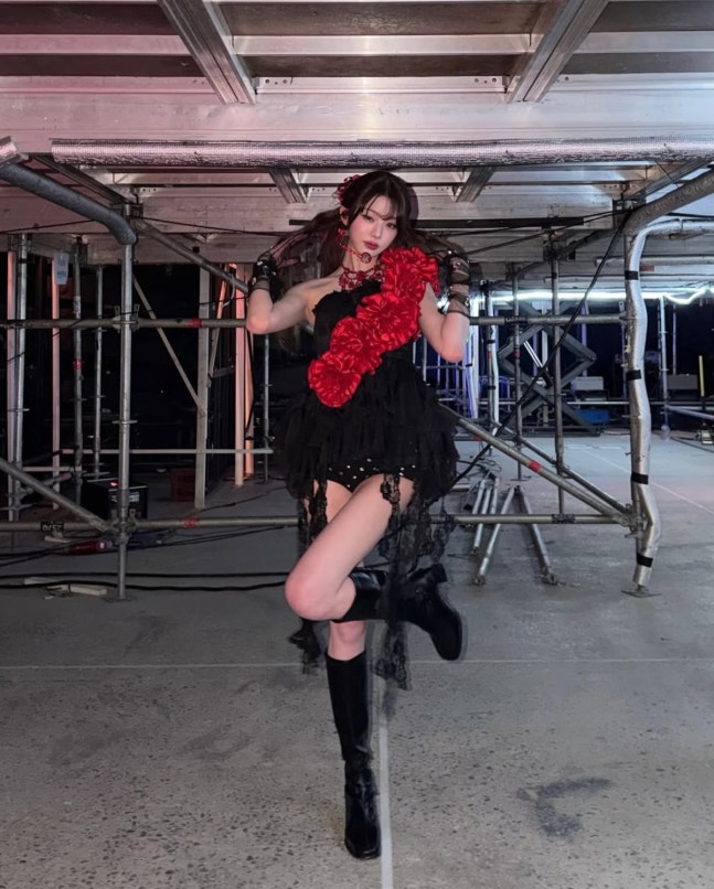 사진 속 장원영은 붉은색 미니드레스를 입고 포즈를 취하고 있다. 한쪽 어깨에 달린 퍼 디테일과 주얼 체인 벨트가 고혹적인 분위기를 더한다. 또 다른 사진에서는 블랙 드레스에 붉은 장식이 포인트로 더해져 강렬하면서도 세련된 무드를 완성했다. 긴 웨이브 헤어와 장밋빛 메이크업이 어우러지며 '무대 위 요정'다운 존재감을 드러냈다.