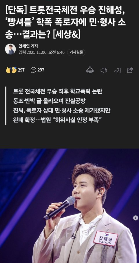 트롯가수 진해성 학폭 폭로자 고소했지만 패소