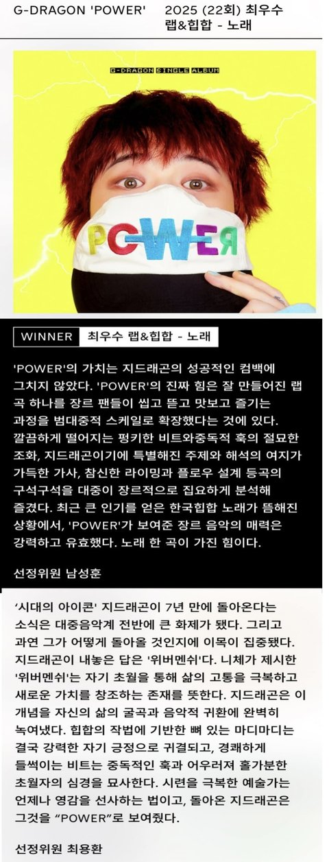 개인적으로 가사 한 줄 한 줄 다 뼈가 있고 숨겨진 의미들 알고 나서 들으니 더 좋아졌음 지디 특유의 워드플레이도 좋고. 단순히 좋고 나쁘고를 떠나 자신이 겪은 일을 본인이 할 수 있는 창구인 음악을 통해 미디어를 풍자하는 게 진심 아티스트답다고 느껴짐. 음악의 힘(파워)을 알게 해준 노래라 정말 잘 만든 곡 같아.