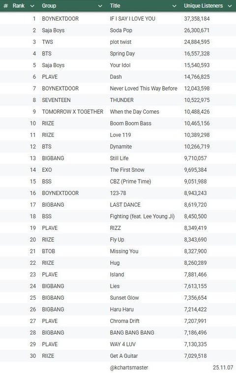 25년 남돌 누적청취자 순위