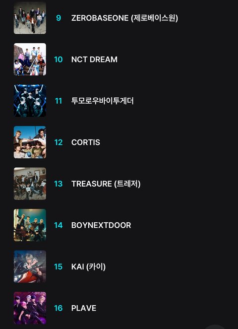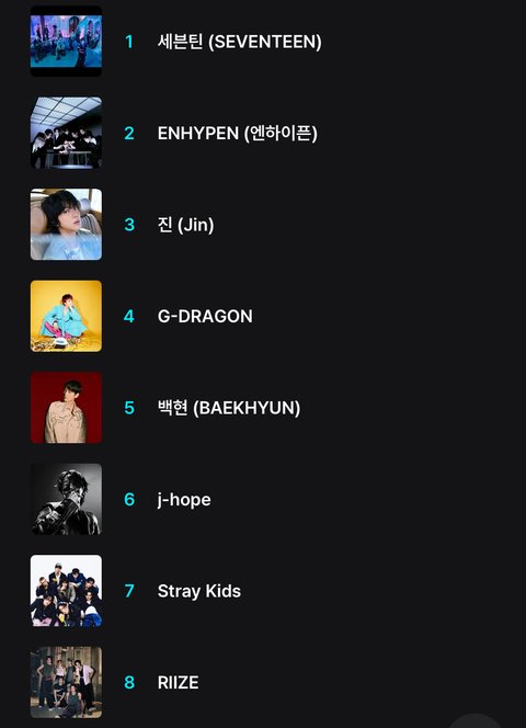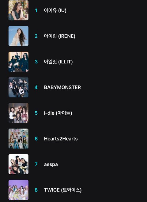 세븐틴 엔하이픈 진 지드래곤 백현 제이홉 스키즈 라이즈 제배원 엔시티 투바투 코르티스 트레저 보넥도 아이유 아이린 아일릿 베이비몬스터 아이들 하투하 에스파 트와이스