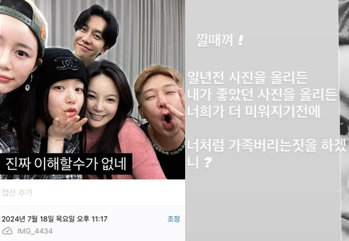 이어 이승기, 이다인 등과 함께 한 사진을 게재하며 근황을 알렸던 바. 하지만 이승기 아내 이다인이 자신의 계정에 "1년도 넘은 사진을 굳이 지금 올리면서 시끄럽게 만드는 이유가 뭐지?"라며 "진짜 이해할 수 없네"라는 말로 MC몽을 저격하기도 했다.