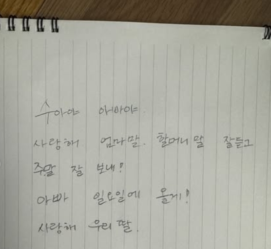 편지에는 '수아야 아빠야. 사랑해 엄마 말 할머니 말 잘 듣고 주말 잘 보내! 아빠 일요일에 올게! 사랑해 우리 딸'이라는 다정한 글이 담겨 있다.