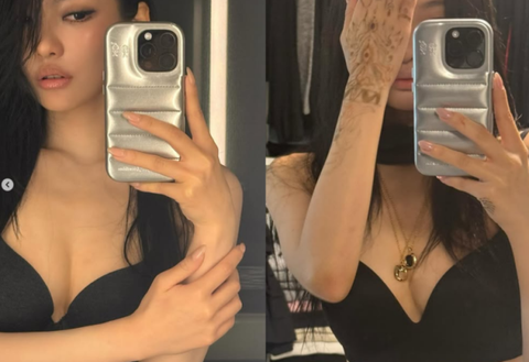 특히 실버 컬러의 퀼팅 휴대폰 케이스와 대비되는 몽환적인 헤나가 눈길을 끈다. 평소보다 어두운 톤으로 완성한 메이크업과 옆으로 넘긴 가르마 방향 또한 고혹적인 분위기를 더했다.