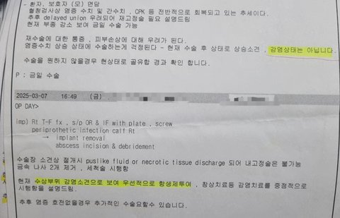 두 번째 담당 의사는 수술 일주일 만에“아래쪽 고정이 약해서 재수술을 하면 뼈가 더 잘 붙을 수 있다.”라고 말했습니다.골절 수술 후 일주일 만에 다시 수술을 해야 한다는 것도 납득하기 어려웠지만 그보다는 통증과 붓기 감각 이상이 더 우려스러웠습니다.저와 가족은 계속해서 “통증이 비정상적이고 감염이 의심된다”고 호소했지만,두 번째 의사 또한“감염 징후는 없다. 통증과 감각 이상은 시간이 지나면 괜찮아질 수도 있다. 수술 여부는 선택사항이다.”라고 했습니다.