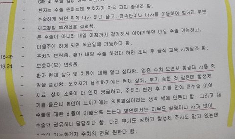 그러나 아래 첨부 서류를 보면, 같은 날 오전에는 ‘감염 징후 없음’이라 적혀 있고,오후 수술 후에는 ‘감염 상태’라고 기록되어 있습니다.
