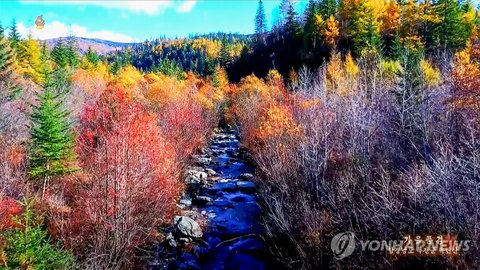 (사진1 설명) (서울=연합뉴스) 북한 조선중앙TV가 12일 방영한 함경남도 부전군 옥련산의 가을 풍경. 옥련산은 천연기념물인 옥련산돌강이 있는 명승지다. <조선중앙TV 화면> 2025.11.12