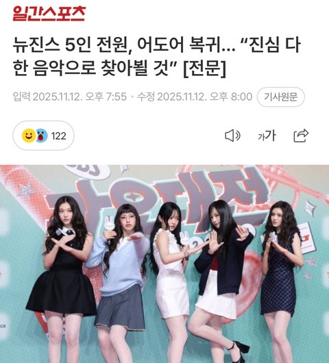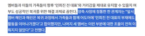 + 애초에 어도어와의 면담은 남극1명 제외하고 다같이 참석했는데 혜인 해린은 민희진없이도 활동하겠다는거에 합의가 됐고 나머지 3명은 조율이 안됐음 그래서 면담 이후에 혜인 해린측만 어도어 복귀의사를 따로 전했다고 함