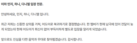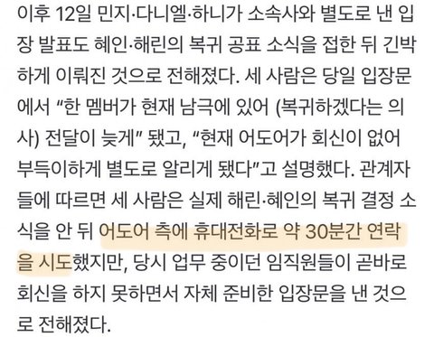 혜인 해린 복귀소식 보자마자 3명 어도어측에 연락시도하고 “30분” 동안 회신이 없자 자체 입장문 발표ㅋㅋㅋㅋ