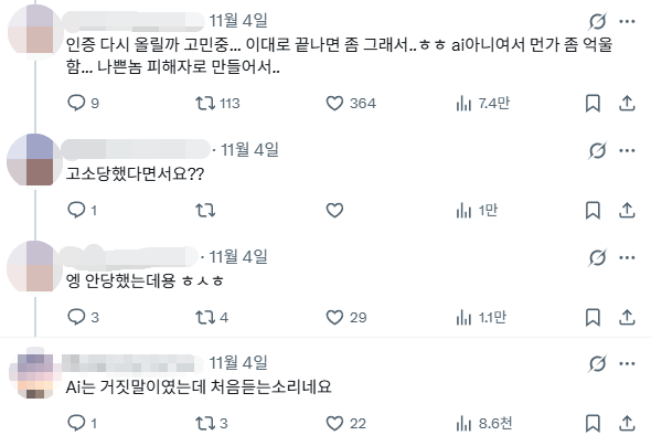 하지만 소속사 측의 고소 공지에도 A씨는 입장 번복을 계속하며 추가폭로를 예고했다. 이에 한 누리꾼은 "고소당했다면서요?"라고 의문을 제기했고, A씨는 "엥 안당했는데용"이라고 반박했다. 이후 소속사 측의 고소 공지를 담은 보도를 본 A씨는 "Ai는 거짓말이였는데 처음 듣는 소리"라고 주장, 차후 그가 보일 행보에 이목이 쏠리고 있다.