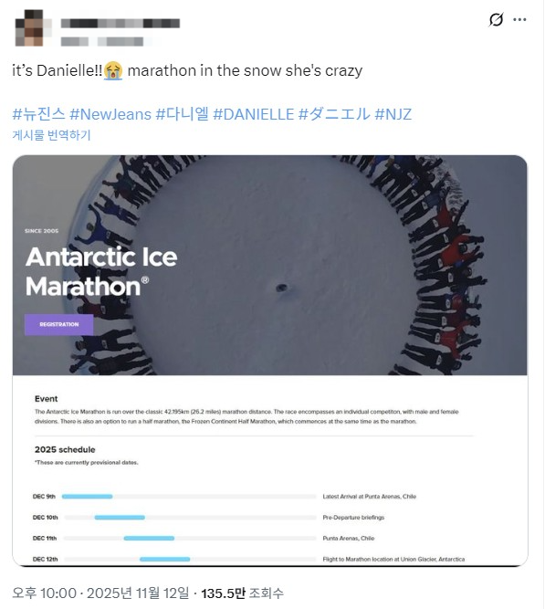 X 캡처.이후 온라인상에서는 남극에 체류 중인 멤버가 누구인지를 두고 여러 추측이 이어졌다. 그중 “다니엘이 남극 마라톤 대회 참가를 위해 머물고 있다”는 글이 소셜미디어(SNS)를 통해 퍼지며 해당 멤버가 다니엘이라는 주장이 힘을 얻고 있다.
