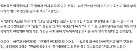 처음부터 둘 셋의 복귀 내용과 조건이 달라서 둘만 먼저 합의 완료한 뒤 바로 기사냈고, 셋 중 둘은 어도어측과 처음엔 합의 조건이 달랐으나 남극 간 멤 빼고 둘이서 현장에서 어도어측 조건 받아들이기로 결정했고 남극 간 멤 답장 기다리느라 확정이 늦은 거 같음.