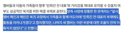 이거였어? 복귀를 위한 조건 전달사항이?ㅋㅋㅋㅋ 그래놓고 어도어로부터 회신이 없어서 셀프 복귀 발표했다고?ㅋㅋㅋㅋ 얘네 아직 정신 못차렸네 남의 회사 꿀꺽 하려는 사람이랑 같이 작업하라고? 어도어에서는 제발 받아들이지마라 민 아줌마같은 개념을 가진 사람은 업계에서도 퇴출되어야 마땅하다