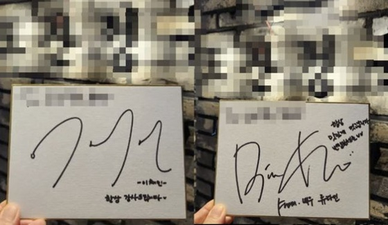 /사진=온라인 커뮤니티공개 연애 중인 배우 이채민, 류다인의 목격담이 전해졌다.최근 온라인 커뮤니티를 통해 이채민과 류다인의 친필 사인이 담긴 사진이 공개됐다.
