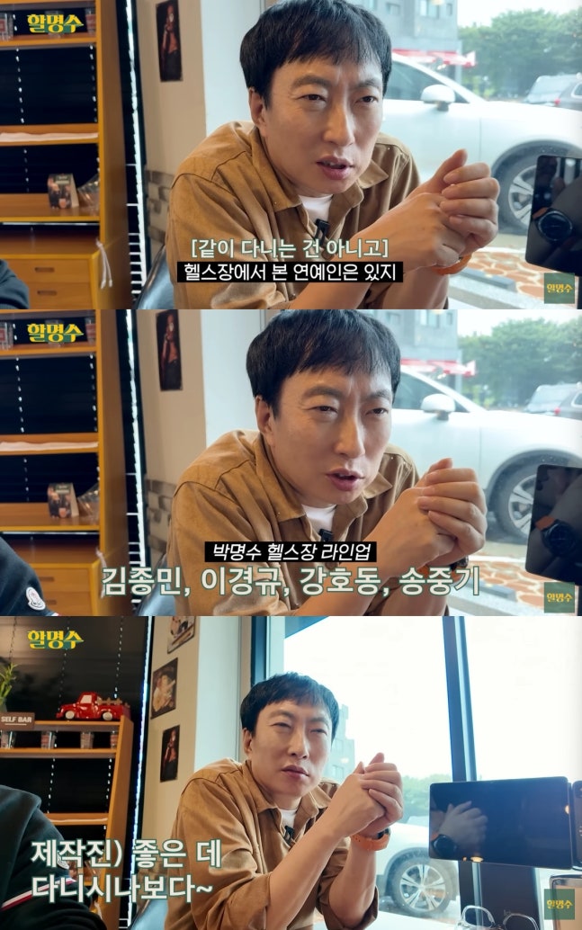 박명수 또한 헬스장 인맥을 공개했다. 그는 '할명수'에서 '헬스장에 같이 다니는 연예인이 있냐'는 질문에 "(헬스장에서) 본 연예인들은 있다. 김종민, 이경규, 강호동, 송중기가 있다"고 밝혔다.
