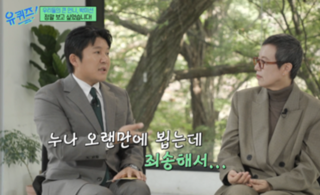 [OSEN=김수형 기자] ‘유 퀴즈 온 더 블럭’에서 배우 박미선과 MC 조세호의 만남이 뜨거운 관심을 받고 있다.유방암 투병 사실을 공개하고 치료에 전념하던 박미선이 10개월 만에 방송에 복귀한 가운데, 조세호가 최근 불거진 유방암 인식 캠페인 행사 논란과 관련해 박미선에게 직접 사과하며 화제를 모으고 있다.