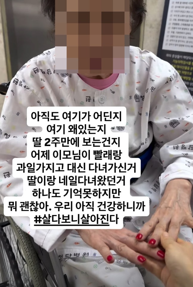 이어 "아직도 여기가 어딘지, 여기 왜 있는지, 딸 2주 만에 보는 건지, 어제 이모님이 빨래랑 과일 가지고 대신 다녀가신 거, 딸이랑 네일 다녀왔던 거 하나도 기억 못하지만 괜찮아. 우리 아직 건강하니까"라는 글로 애틋함을 자아냈다.