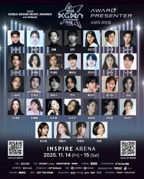 14, 15일 인천 인스파이어 아레나에서 ‘2025 코리아 그랜드 뮤직어워즈 with iM뱅크’(2025 KGMA)가 열린다. ‘아티스트 데이’와 ‘뮤직 데이’로 나눠 진행되는 이번 시상식에는 강태오, 공승연, 권율, 김단, 김도연, 김도훈, 김민석, 김요한, 문채원, 박세완, 배현성, 변우석, 서은수, 서지훈, 신승호, 안효섭, 엄태구, 연우, 옹성우, 윤가이, 이설, 이세영, 이열음, 이주명, 이주연, 정준원, 주현영, 채서안, 최수영, 최윤지, 추영우, 하영(가나다순)이 시상자로 함께한다.