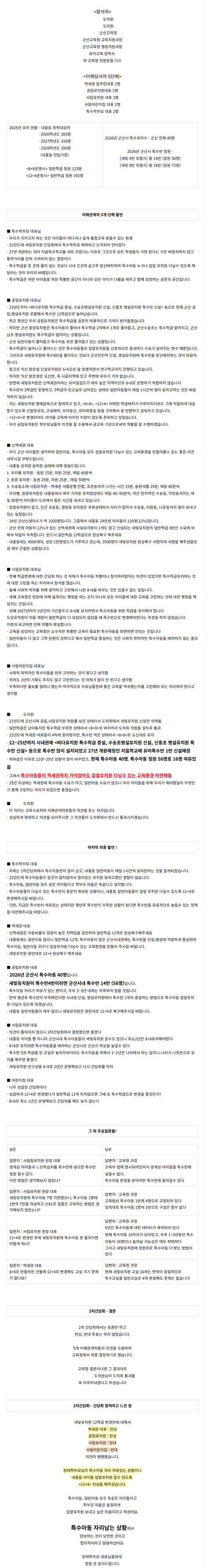 ●25년도 (11월 예다음 입주예정)1. 10/1 새빛유치원 일반학급 원상복귀 시위 &1차 간담회 (3500명의 서명지도 교육청 전달) https://youtu.be/dhEuPVCxPLc?si=0xV8D8RFM3pkNMru2. 1차 간담회 내용 : 26학년도 군산 전체 특수아동 11명 증가- 그 중 7명 새빛유치원 희망, 전학 희망 원아 없음 위 내용에도 불구 사립 유치원 원장님, 사립 어린이집 원장님, 장애 학부모 대표님 12+3학급 반대3. 8+8학급으로 11/3 우선모집 접수 시작4. 2차 간담회 내용 : 12+3 찬성 3표,반대 2표 (원안은 12+3이나 12+4로 변경한다고 진행됨)