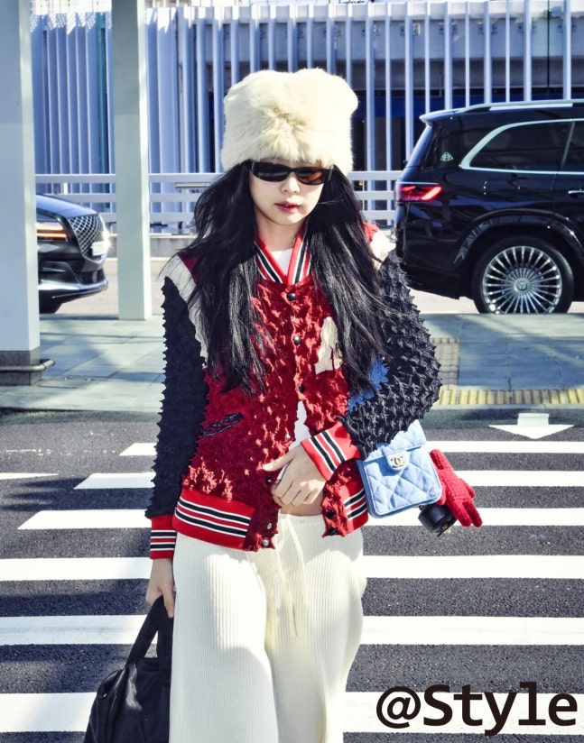 블랙핑크 제니는 고양이 귀처럼 솟은 실루엣의 크림 퍼 햇으로 상단에 볼륨과 캐릭터를 더했다. 질감이 독특해 톡톡 튀는 카디건과 아이보리 니트 팬츠가 대비를 만들고, 미니백이 색감의 포인트를 보탠다. 선글라스까지 더해 강약이 분명해졌고, 모자의 독특한 실루엣이 룩의 분위기를 이끌었다.