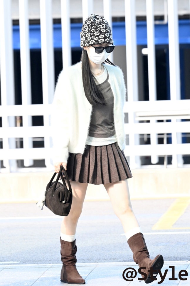 트와이스 다현은 플라워 패턴의 니트 비니를 낮게 써 경쾌한 포인트를 더하고, 선글라스와의 조합으로 무드를 또렷하게 잡았다. 보송한 크림 카디건과 브라운 플리츠 스커트·부츠가 따뜻한 톤을 맞추며, 비니의 블랙과 화이트 조화가 컬러를 정리한다. 화이트 삭스로 밝기를 한 번 더 올려 가벼움을 연출, 전체가 균형 잡힌 캐주얼로 마무리됐다.