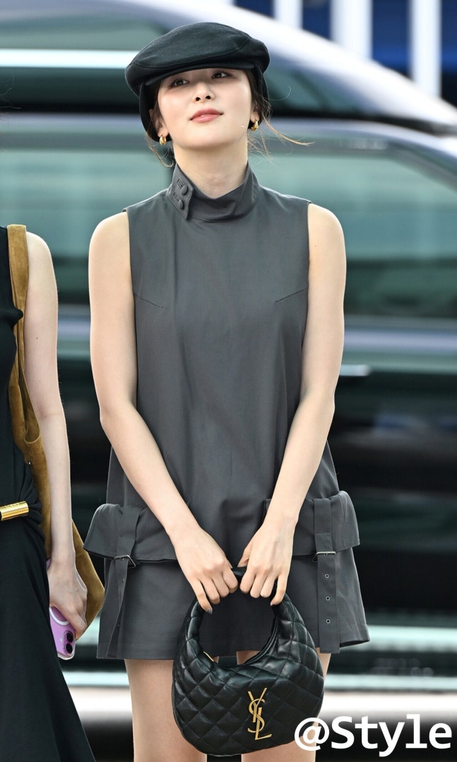레드벨벳 슬기는 블랙 헌팅캡과 그레이 미니 드레스를 매치해 차분한 무드를 완성했다. 헌팅캡과 같은 톤의 퀼팅 백이 컬러 균형을 받쳐 준다. 골드 톤의 미니멀한 주얼리를 스타일링해, 모자로 확실한 포인트를 안겨줬다.