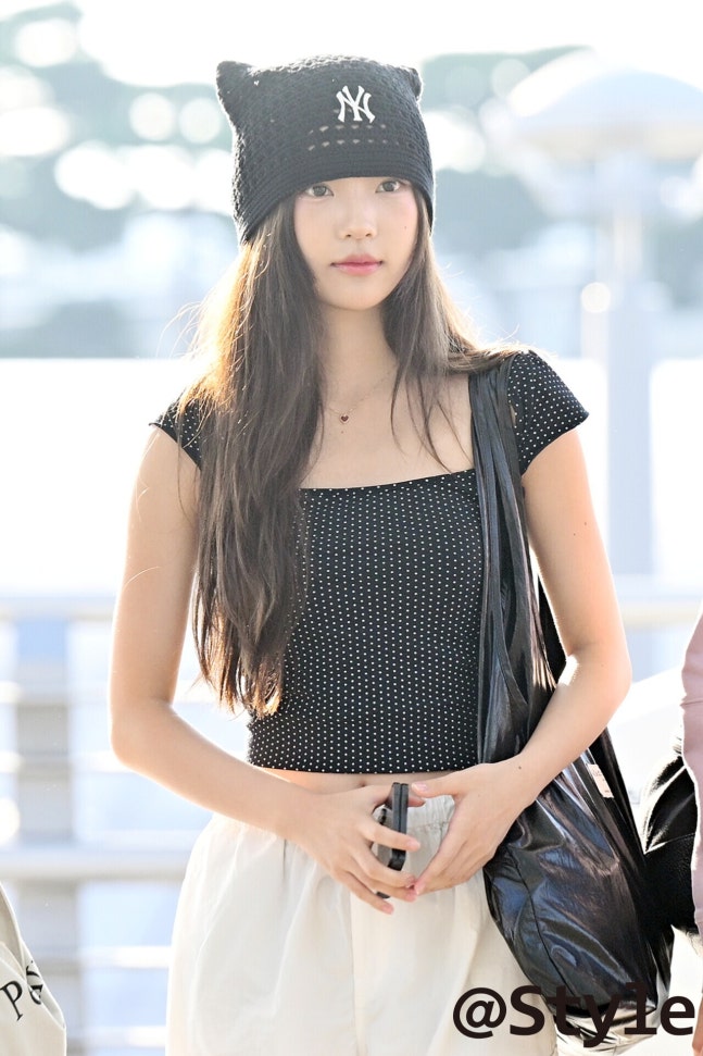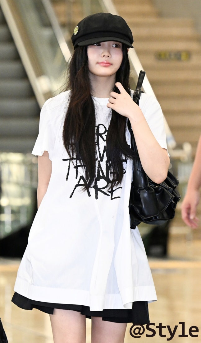 아일릿 원희는 깜찍한 뉴스보이 캡을 스타일링 했다. 자연스러운 롱 헤어와 모자가 패셔너블한 대비를 이룬다. 모자의 핀 장식이 단조로움을 덜어내고, 블랙 스커트와 가방까지 컬러를 맞춰 상하가 통일된다. 오버사이즈 화이트 그래픽 티와의 대비로 실루엣이 가벼워져 전체가 깔끔한 캐주얼 무드로 남았다.