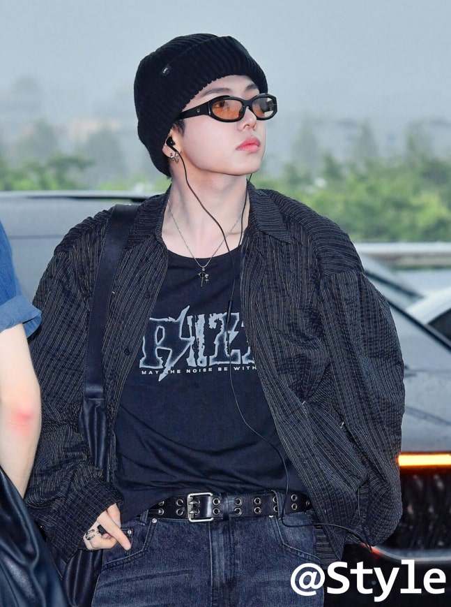 보이넥스트도어 명재현은 블랙 리브드 비니와 선글라스로 스타일리시한 무드를 단단히 잡았다. 스트라이프 셔츠에 그래픽 티를 레이어드하고 워시드 데님과 스터드 벨트로 텍스처를 맞춰 올블랙에 가까운 톤을 유지했다. 비니의 매트한 질감이 시크한 분위기를 만들어 주고, 이어폰, 네크리스 그리고 가죽 벨트까지 더해져 통일감이 살아난다.