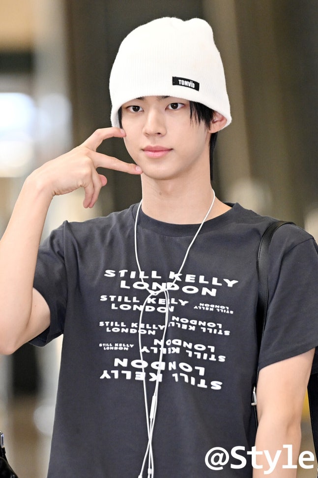 투어스 도훈은 화이트 비니로 룩의 무드를 단번에 잡았다. 차콜 그래픽 티 위로 밝은 비니를 깊게 눌러써 헤어 라인을 정돈했고, 자연스러운 앞머리 덕에 소년미가 더욱 돋보인다. 작은 로고 패치가 과하지 않게 포인트를 보태 캐주얼 스타일링의 완성도를 높였다.