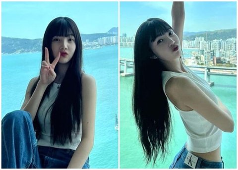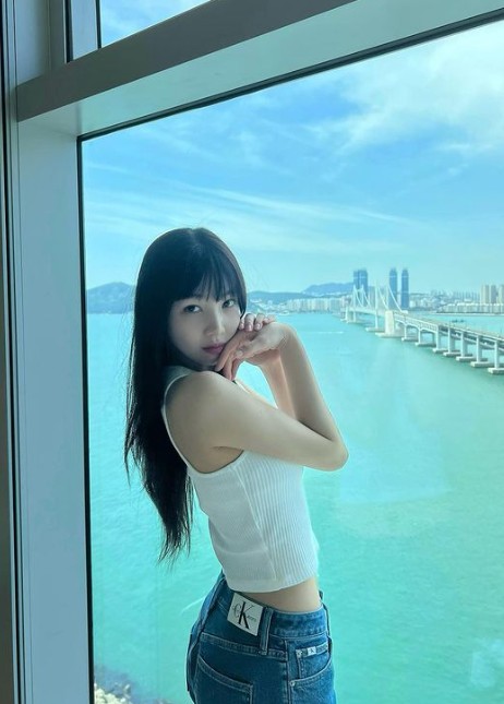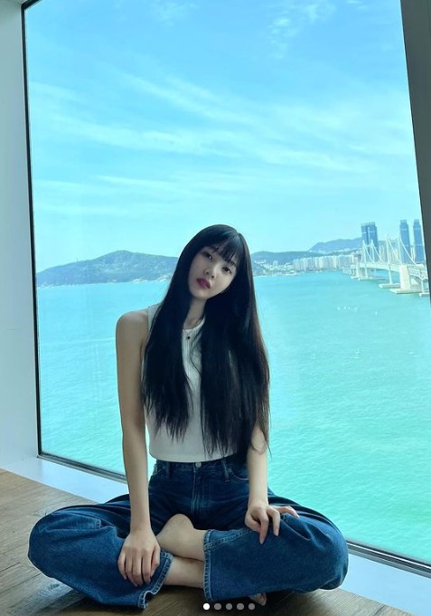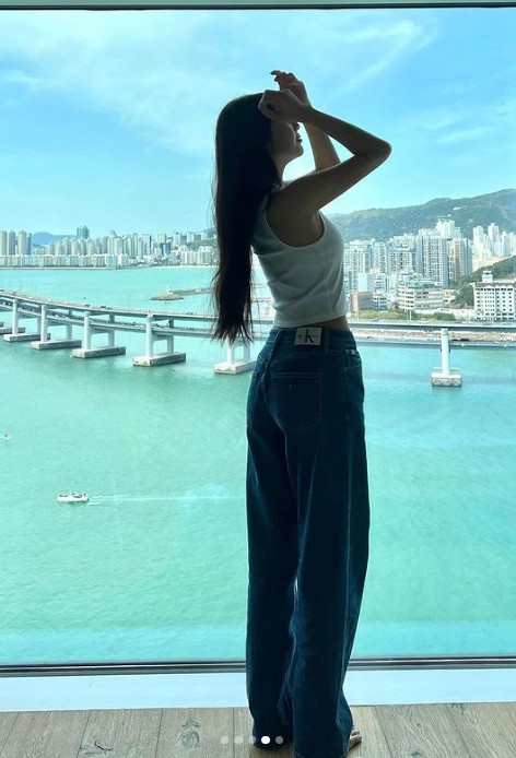 조이는 드넓은 바다가 보이는 풍경을 뒤로하고 사진을 찍었다. 가녀린 어깨라인이 드러나는 민소매 상의와 청바지를 입고 몸매를 뽐냈다.