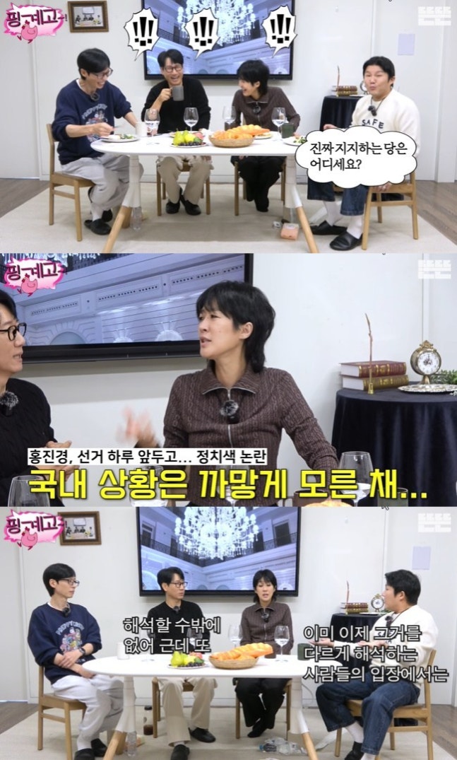 홍진경은 “나는 이 당 사람 만나서 얘기를 들으면 이 당 사람 말이 맞는 것 같고, 저 당 사람 얘기를 들으면 저 당 사람 말이 맞는 것 같다. 그래서 대선 때 너무 힘들다. 좋기만 하고, 나쁘기만 한 게 아니지 않나. 우리 인생이 그렇지 않나. 사람도 그렇다. 그래서 나는 진짜 다 사랑한다”라고 답했다.