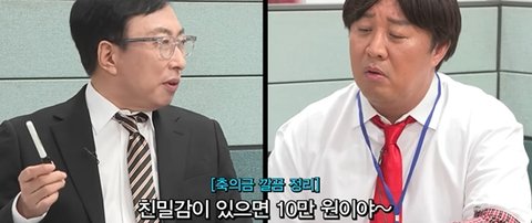 박명수는 "친한 사이라면 10만원을 하는 게 맞고, 일면식 있고 얼굴만 아는 사이라면 5만원이 맞다"라고 단호하게 말했다.