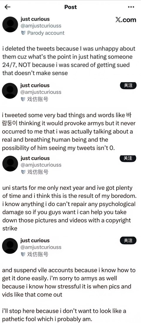 일부러 바람둥이 이런 자극적인 구라썰 붙여서 선동햇는데 정국 욕먹는거 보니까 무서워져서 계폭 ㅇㅇ 그리고 미성년자인듯 대학 어쩌고 하는거 보니