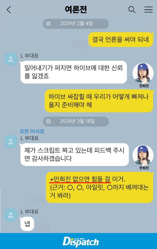 빌리프랩은 그 증거로 민희진과 이 부대표 등의 카톡 대화를 제출했다. 둘의 카톡에는 "결국 언론을 써야 겠네", "하이브 까는 기사 내는 건 좋은데", "그리고 우리는 여론전 준비" 등의 대화가 있었다.