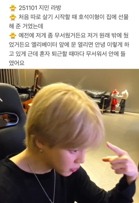 응 아니예요^^ 지민 11월 라방때 이미 저 피규어 과거에 문앞 밖에 뒀었다가 무서워서 운동방안에 들여놨다고 말했는데 송씨 저 여자분이 올린 영상은 지민이 라방에서 말했던 과거 문앞에 뒀던 그 과거 영상을 이제서 또 관심 받을려고 올린거임 ㅎㅎ 악개줌마들 저 여자 라방 좀 그만 찾아가ㅋ 그러니깐 댓글 그만달라고 저여자가 영어로 쓰고 저딴 과거 영상이나 관종처럼 올리는거자나ㅋ