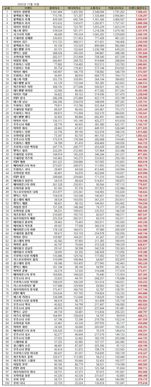 한국기업평판연구소는 걸그룹 개인 브랜드평판 2025년 11월 빅데이터 분석을 위해 지난 10월 16일부터 11월 16일까지 걸그룹 개인 730명의 브랜드 빅데이터 113,791,375개를 추출하여 걸그룹 개인 브랜드에 대한 소비자들 행동분석을 가지고 만든 참여지수, 미디어지수, 소통지수, 커뮤니티지수로 브랜드평판지수를 분석했다.