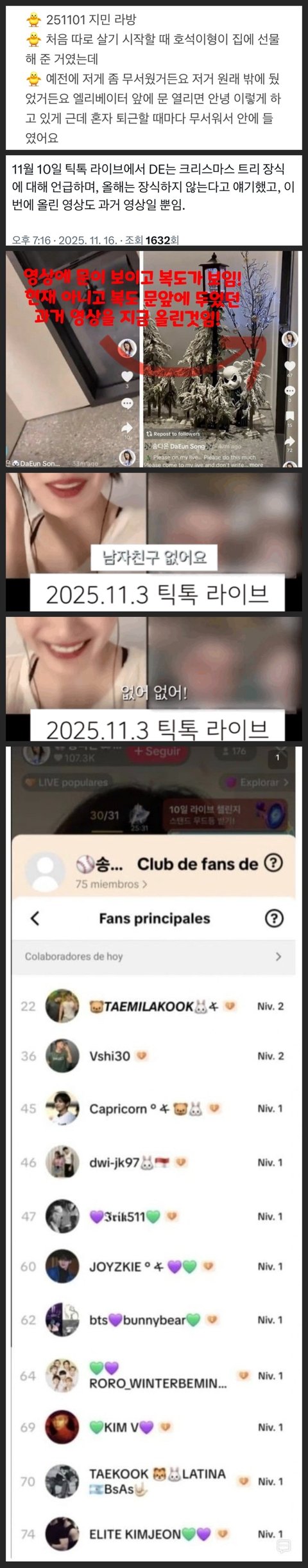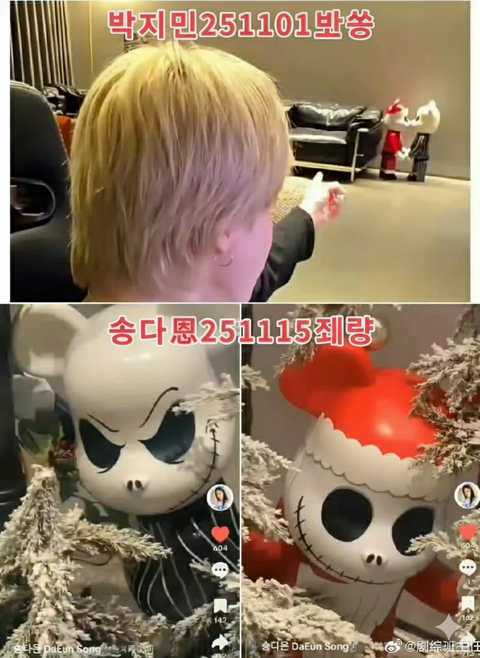 엘리베이터 영상 이후, 빅히트와 박지민은 결별 관련 공식 입장을 발표했습니다. 하지만 송다은 측에서는 이 주제에 대해 아무런 언급도 하지 않았습니다. 박지민 팬들은 여전히 송다은의 틱톡 라이브에서 악성 댓글로 그녀를 괴롭히고 있습니다. 어제 송다은은 지난번 박지민의 라이브에서 보았던 것과 똑같은 인형 두 개가 나오는 영상을 틱톡에 올렸습니다. 송다은은 박지민 팬들에게 '당신들의 착각은 착각일 뿐입니다. 제가 박지민과 함께 살고 있다는 사실은 변하지 않을 것입니다!'라고 말했습니다.