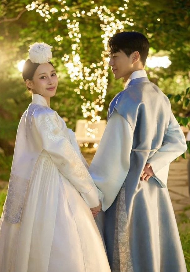 이어진 화보에서는 화사한 한복을 맞춰 입은 두 사람이 야외 조명 아래에서 서로를 바라보며 미소 짓고 있다.