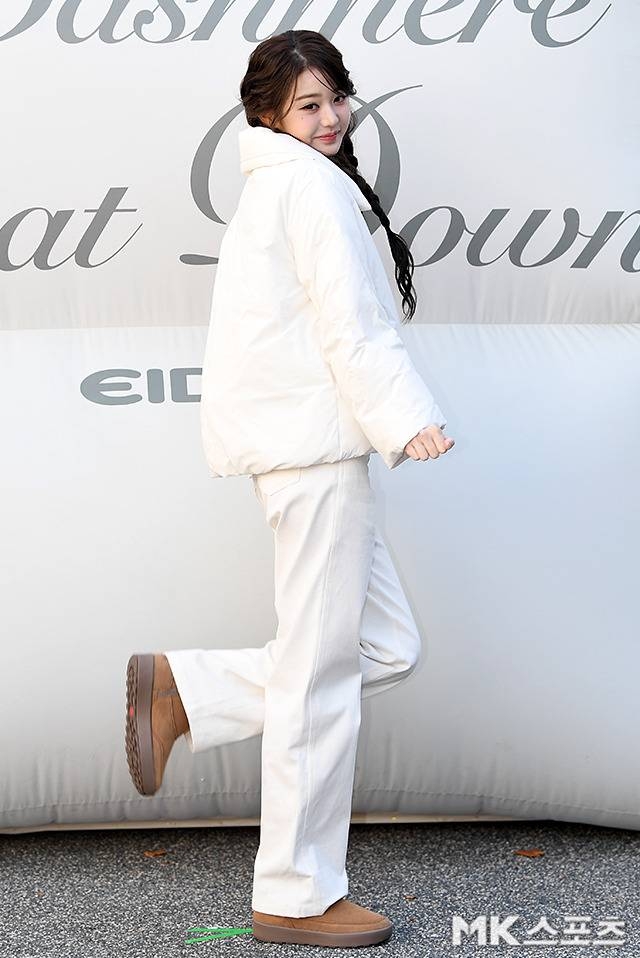 메이크업도 완벽했다. 투명한 베이스에 핑크 블러셔를 얹어 얼굴이 더 작아 보였고, 눈가는 브라운 음영과 위로 날렵하게 올라간 속눈썹으로 드라마틱하게 완성됐다. 입술은 글로시 핑크 톤으로 촉촉하게 채워 ‘겨울 인형’이라는 말이 절로 나오는 비주얼이었다.현장 관계자에 따르면 “카메라가 장원영만 따라가서 이동 자체가 어려울 정도였다”고 전했다.