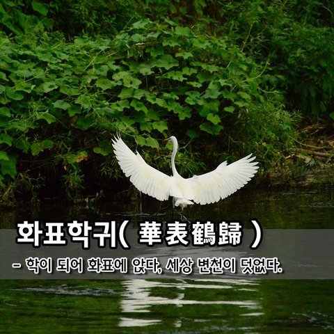 세태에 따라 돌변하는 인간 세상에는 어울릴 수 없어 부득이 떠나게 되는 신세를 한탄하고 있다. 순서를 바꿔 鶴歸華表(학귀화표)라고도 한다. 이 이야기는 陶淵明(도연명)이 지었다고 하는 志怪(지괴)소설 ‘搜神後記(수신후기)’에 실려 있다. 지괴소설은 魏晉(위진)남북조 시대 떠도는 신화나 전설, 민담 등 기이한 이야기들을 수집하여 엮은 것을 말한다.