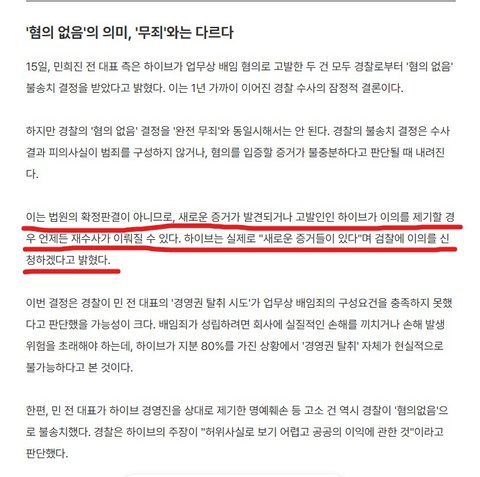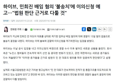 민희진은 배임 무혐의고요 진짜 헛소리 그만 보고 싶네요. 무슨 타진요도 아니고..