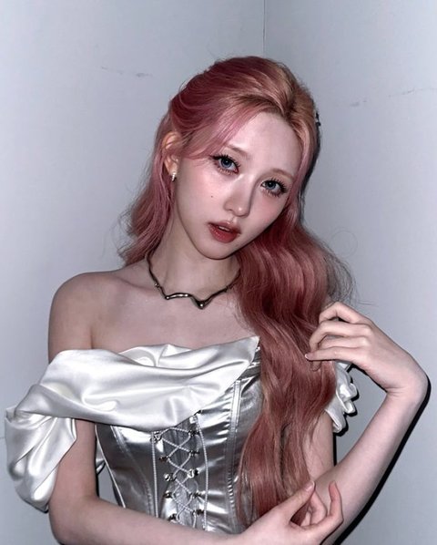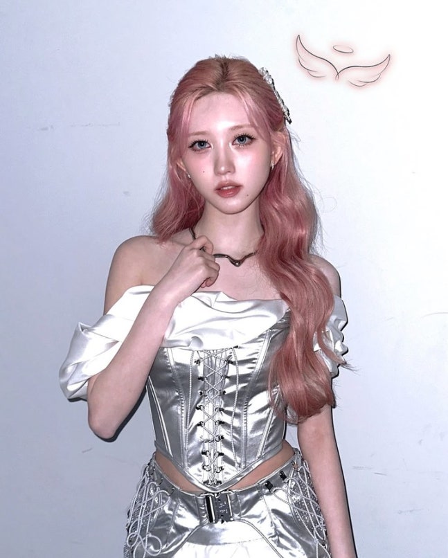 또 다른 컷에서는 목걸이 포인트와 쇄골·어깨 라인을 드러낸 포즈로 시선을 사로잡았다. 핑크빛 웨이브 헤어가 찰떡으로 어울리는 모습으로, 여기에 흰색 헤어핀을 더해 순수한 무드를 강조했다.