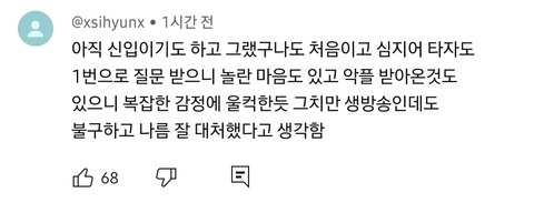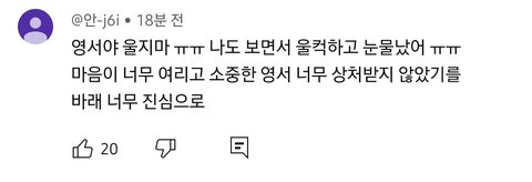 운건 아니고 울것같은 느낌이었는데 나였으면 처울었을듯 고쳤으면 하는 거 하나씩 말하기같은 거였는데 처음 시작이 영서였음 근데 첨이라 멤버들이 쭈뼛거리면서 말해서 ㅈㄴ진지한 분위기╋영서 살짝 노잼멤이라 놀릴거리없음이 합쳐져서 그리된듯