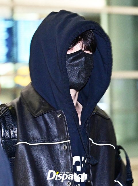 정국은 올블랙 스타일로 시크한 공항패션을 완성했다. 후드집업과 마스크에도 강렬한 카리스마가 돋보였다.