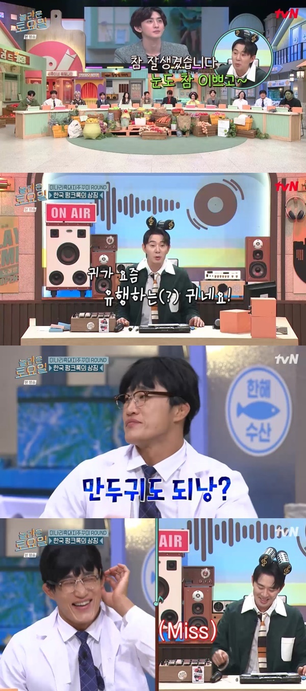 이어 붐은 최정훈 원샷이 잡히자 “참 잘생겼다. 눈도 참 예쁘고. 요즘 유행하는 귀다. 요정 귀”라고 미모를 칭찬했다. 이에 김동현은 “만두귀도 되냐”며 묻어가려 했고, 붐은 실로폰으로 땡을 치려다가 실수를 해 웃음을 자아냈다. (사진=tvN ‘놀라운 토요일’ 캡처)
