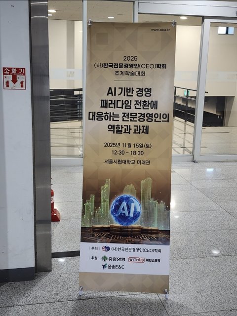 (사진2 설명) 서울시립대학교 미래관에서 열린 '한국전문경영인(CEO)학회 학술대회 - AI기반 경영 패러다임 전환에 대응 <(원판 사진 resize) 촬영정보: 셔터속도 1/60s, 초점거리 23mm, 조리개 f1.8, 촬영감도 ISO 100, 노출 biasing(바이어싱, Q·point(동작점) 설정) 0.0ev, 삼성 Galaxy S22 Ultra 휴대폰 카메라 사용, 최대우 촬영>