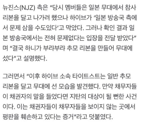 당시 하이브는 뉴진스뿐 아니라 각 레이블 아티스트의 추모 리본 패용 여부와 방식에 대한 종합적인 검토를 진행 중이었습니다.