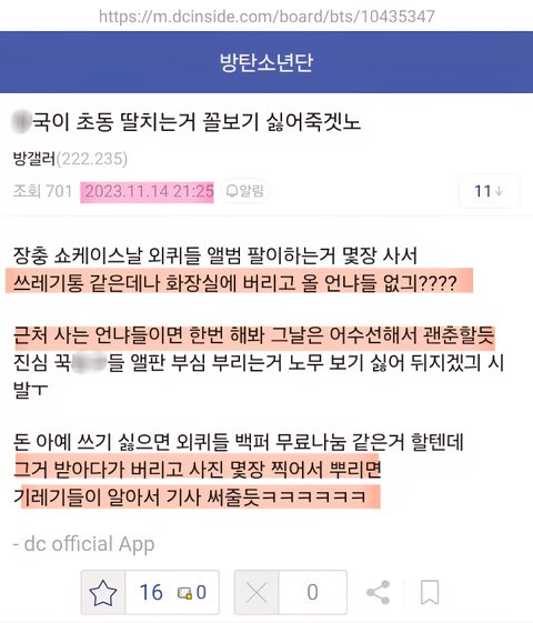 저거 정국이 초동에 발작한 방갤악개줌들 작품이잖아 ㅋㅋㅋㅋㅋㅋㅋㅋ 쓰니야 이딴 글 올리면 니들 정국이한테 열폭한것만 더 알려질듯 ^^